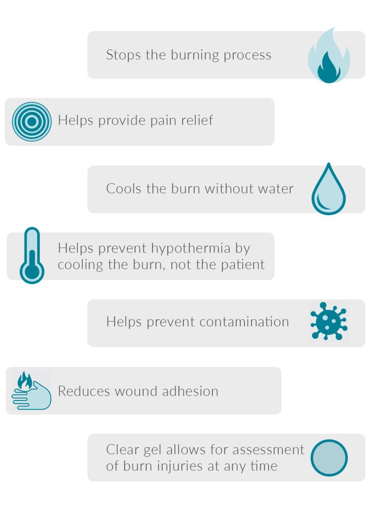 In a pre-hospital setting you would need 60 litres of cool clean running water for each burn injury and this isn’t always accessible or easy to do so in every environment. In any situation where a 20 minute supply of cool running water is not available there are alternative solutions such as burn gels.