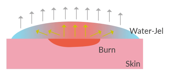 Water-Jel Burn Dressings are sterile dressings that are soaked in 96% de-ionized water with hyaluronic acid. It cools down the burn using convection cooling without needing copious amounts of water. Cooling by means of convection rather than evaporation, Water-Jel draws heat to the surface and disperses it into the atmosphere. The burn is now cooling and protected from outside influences