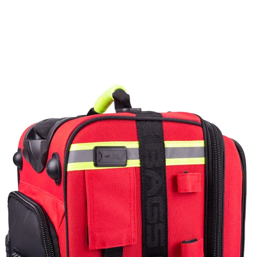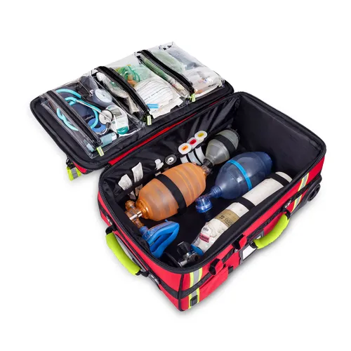 This large medical response bag can be used as a backpack, it can be towed on its built-in wheels or it can be carried conventionally by either of its two ergonomic handles. The medical backpack features a concealed shoulder strap system to avoid snagging when not in use. Likewise, the telescoping handle can be tucked away neatly in a side pocket when not required. The bag opens like a clam shell, allowing instant access to the main compartment and the three transparent, zippered compartments. The bag also features an outside pocket with 4 quick-release, colour-coded equipment pouches with transparent windows to allow easy identification of the contents, and on the other side you will find elasticated loops on an equipment board to secure your smaller supplies. This bag has a maximum recommended load weight of 25kg; the built-in wheels and telescopic arm will allow the transport of your emergency equipment with minimal effort and greatly reduce manual handling issues. Although designed for medical professionals and used in many hospitals, this equipment bag with wheels, like all of Elite Bags’ creations, is extremely versatile, making it the ideal  wheeled, semi-rigid bag for any professional who needs to organise and transport critical equipment.