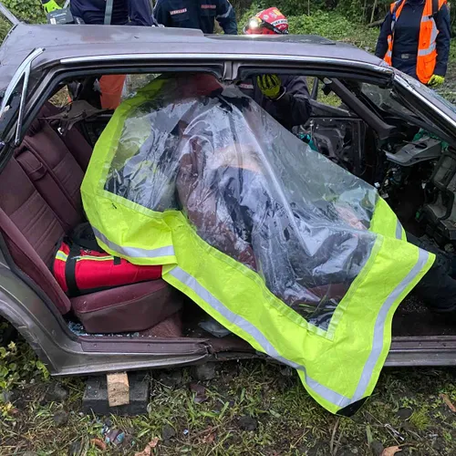 The SHI011protective blanket has been specifically designed for use during extractions from road traffic accidents. Used to cover the and protect the vehicle occupant during the extraction process, it features 4 powerful magnets that allow the fabric to be secured to the vehicle chassis, reducing unwanted movement. A replaceable transparent window in the blanket can be placed in front of the occupant’s face, facilitating communication during extraction.